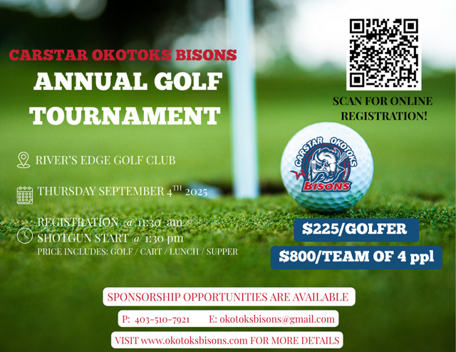 Events 2025 Annual Golf Tournament by bschinnour July 23, 2025August 8, 2025 You can register for our 2025 Annual Golf Tournament by clicking HERE Or you can check out our sponsorship opportunities below contact Shallyn Schinnour if interested at okotoksbisons@gmail.com or 403-510-7921